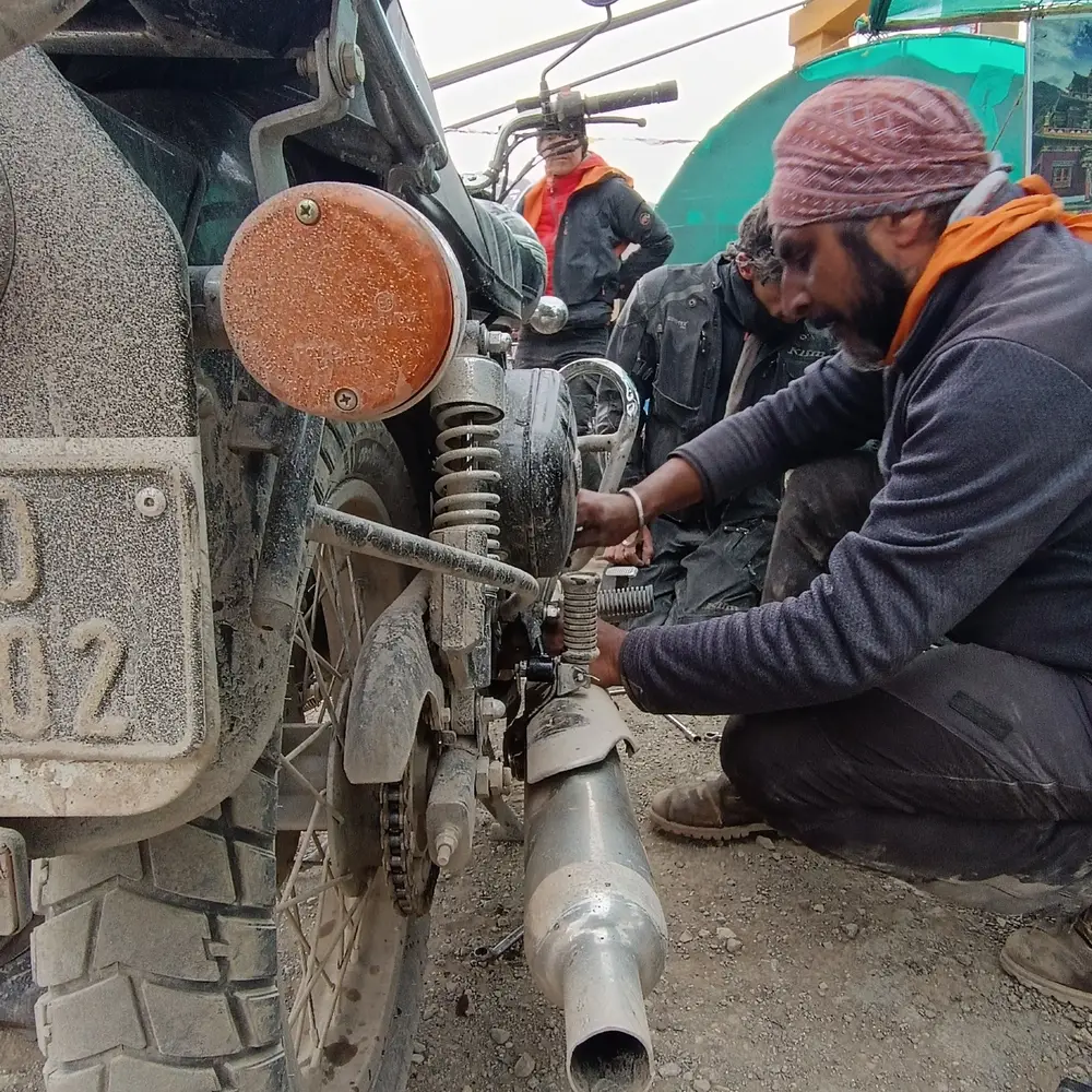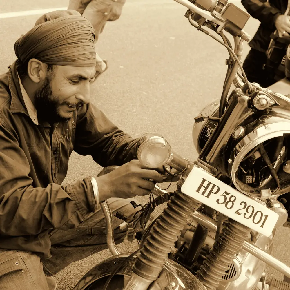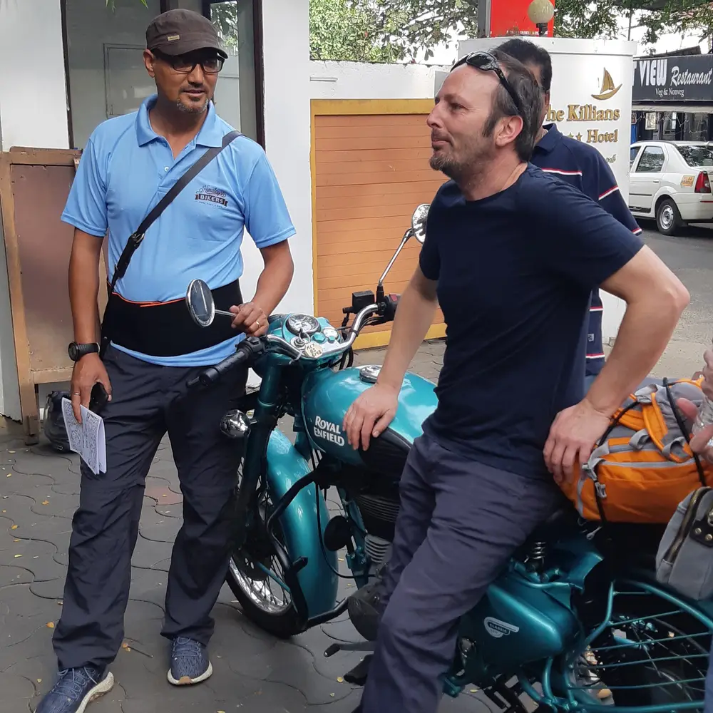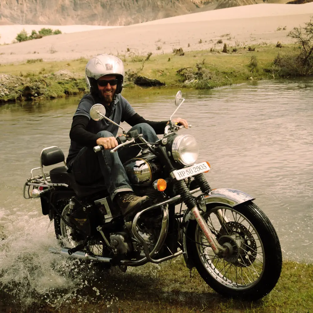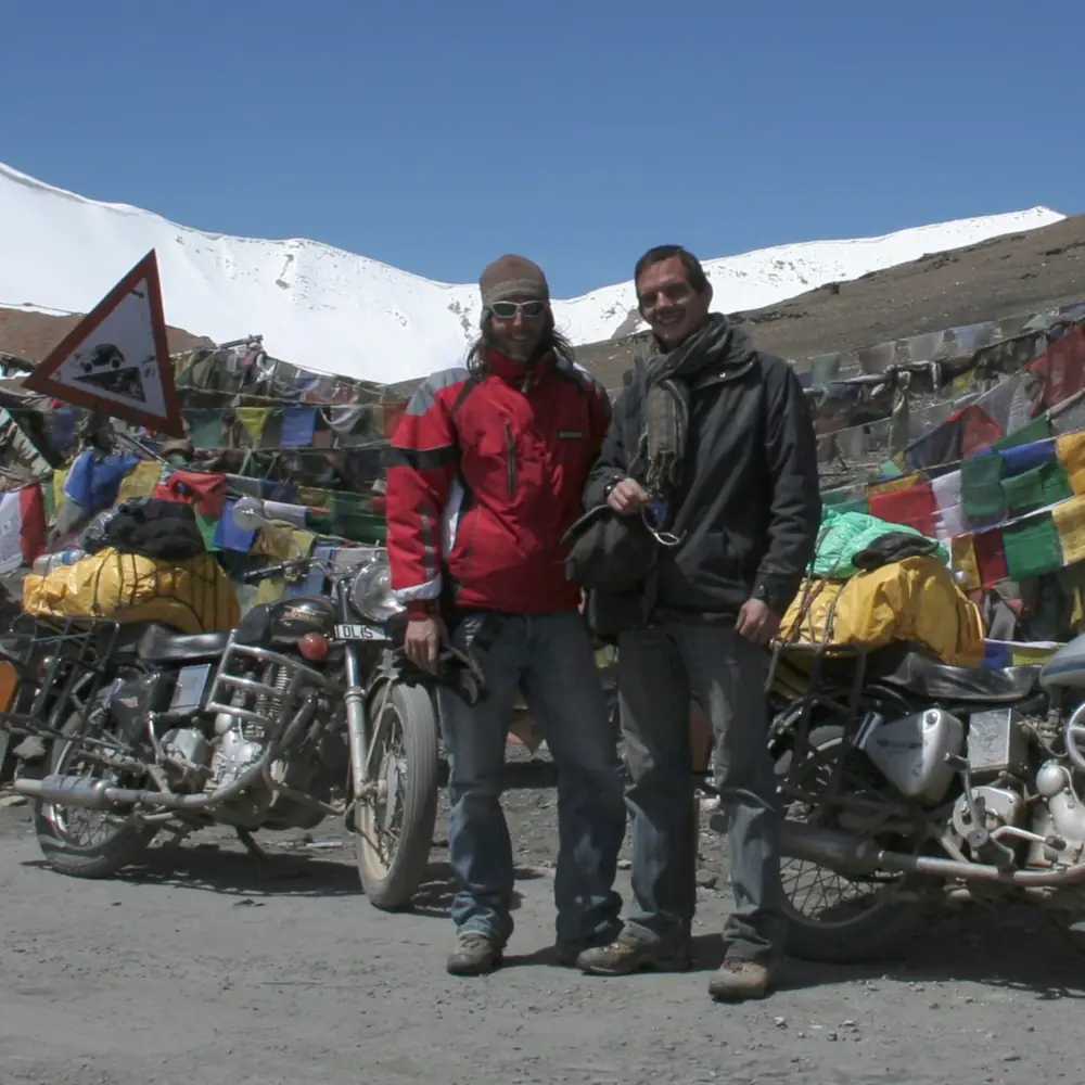 2007 : Une idée germe durant l’hiver : faire découvrir l’Himalaya et le Ladakh à moto à d’autres voyageurs. Gaëtan achète sa première Royal Enfield à Delhi, une Machismo 350 d’occasion. Avec elle, il rejoint Manali puis le Ladakh par la Transhimalayenne, aux côtés de son ami Sylvain. L’aventure le mène rapidement à devenir guide moto pour une agence francophone basée à Delhi. C’est aussi là qu’il rencontre Raja, mécanicien. Une première expérience pour l’un comme pour l’autre. Ils ne se quitteront plus… Yes, ok. Yes, ok. Namaste !