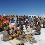 Dernière étape de cette épopée motocycliste, mais il nous reste à franchir le col carrossable le plus haut du monde, le Khardung La (5602 m annoncé par la voirie, mais réellement à 5359 m au gps) d’où nous découvrons le Saser Kangri culminant à 7612 m d’altitude. L’euphorie nous gagne, il est temps de redescendre… Au fur et à mesure que nous approchons de la capitale, l’animation, les habitations, les monastères et le trafic se font de plus en plus ressentir… Nous sommes de retour parmi les hommes… Au pays des dieux ! Le soir, « Ladakhi Party » et dernier repas en compagnie de l’équipe accompagnante… Logement en guesthouse (3500m d’alt.).